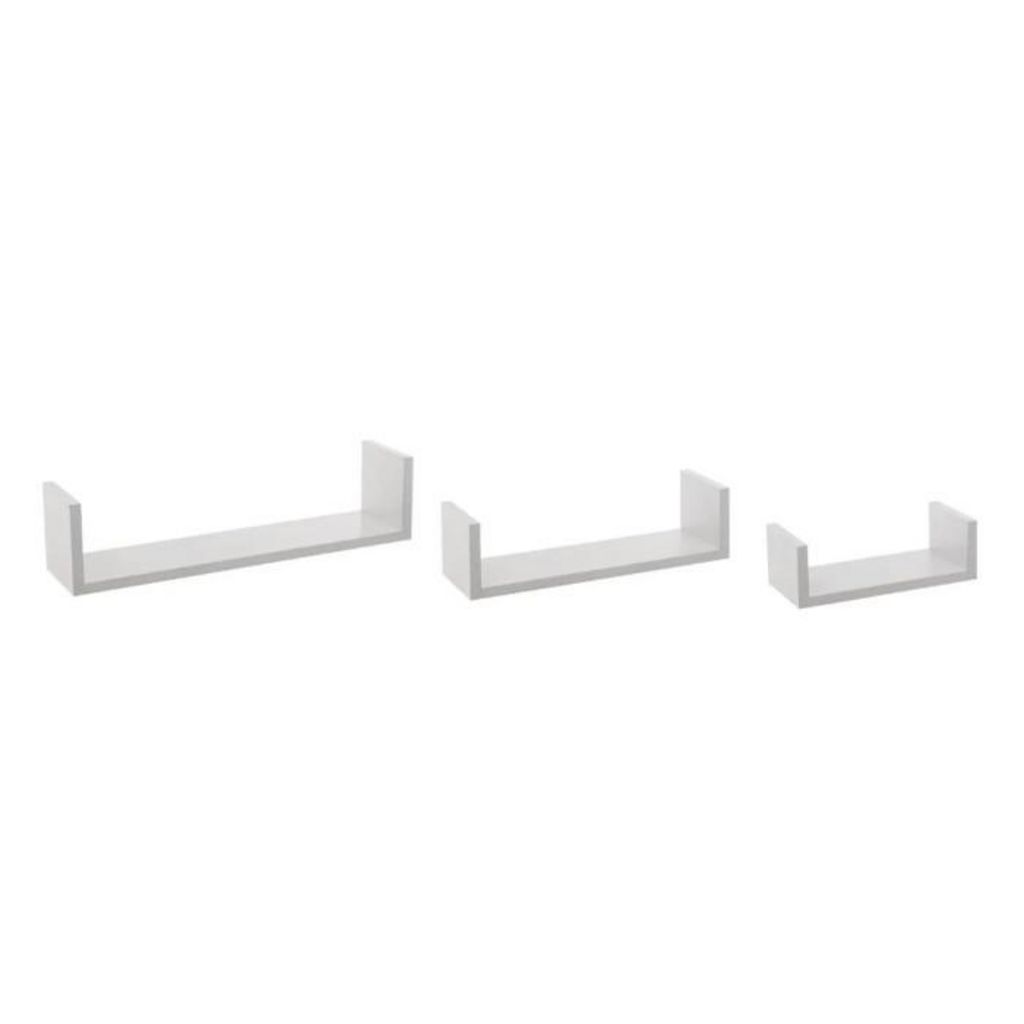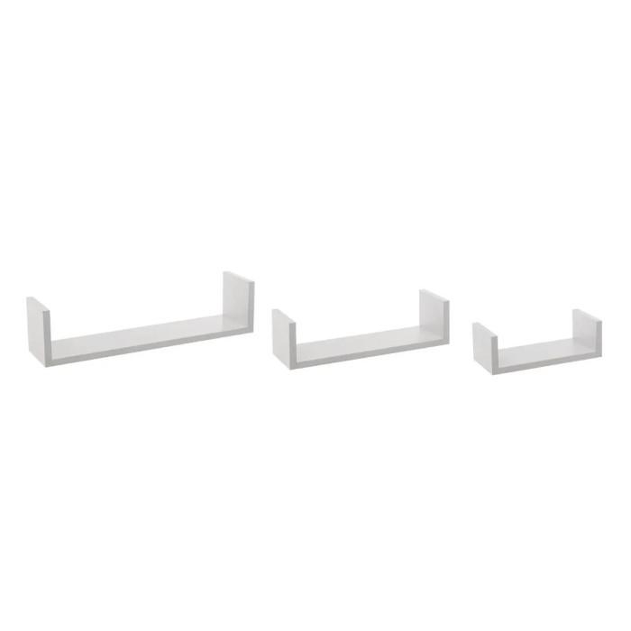Informations Techniques : Dimensions : Taille 1 : L. 22 x l. 10 x H. 7 cm Taille 2 : L. 32 x l. 10 x H. 8,5 cm Taille 3 : L. 42 x l. 10 x H. 10 cm Matière : MDF Spécificités : 3 tailles différentes Lot de 3 étagères A fixer soi-même Notice incluse Poids : 1,4 kg Couleur : Blanc