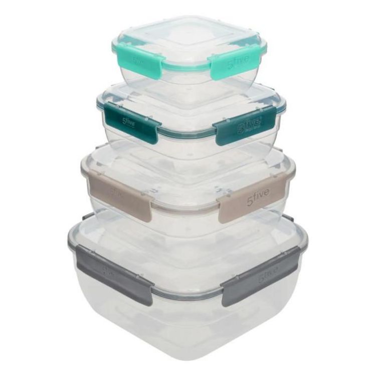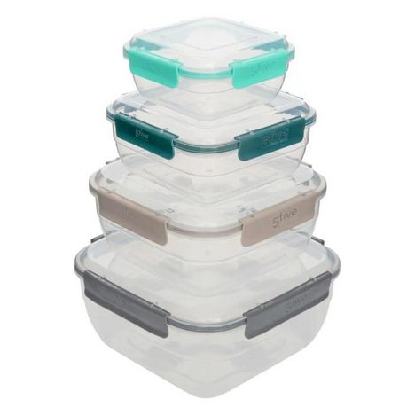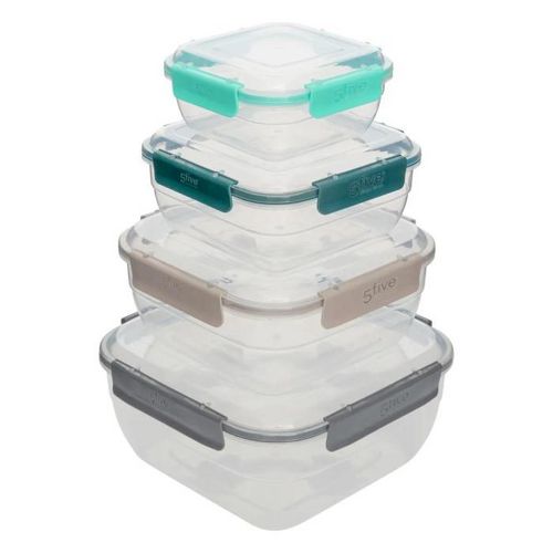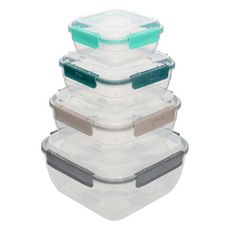 Informations Techniques : Dimensions : L. 20,3 x l. 20,3 x H. 9,4 cm Matière : Polypropylène Spécificités : Pratique & Utile Lot de 4 boîtes de conservation De différentes tailles et coloris Avec couvercles clipsables Compatible micro-ondes, lave-vaisselle et congélateur Forme carrée Capacités : 0,4