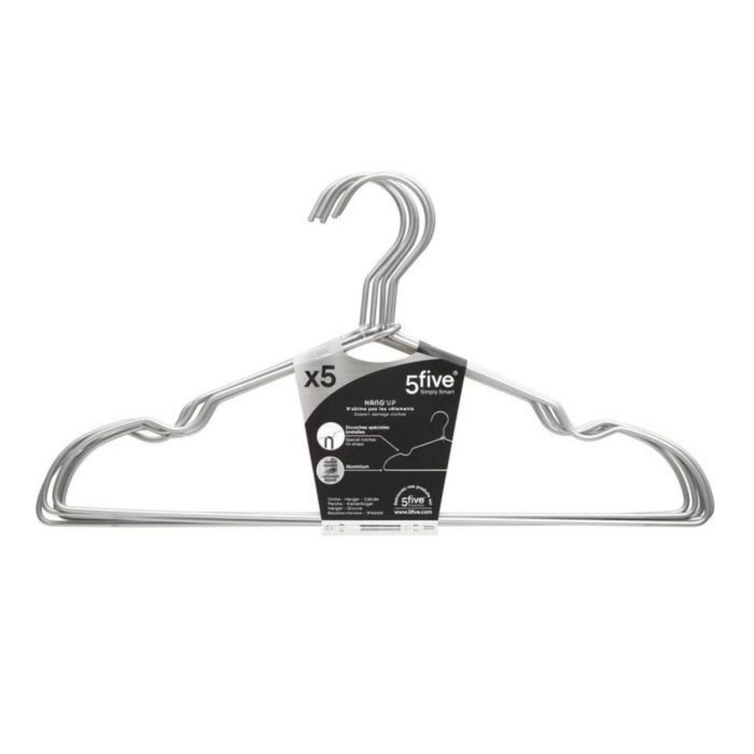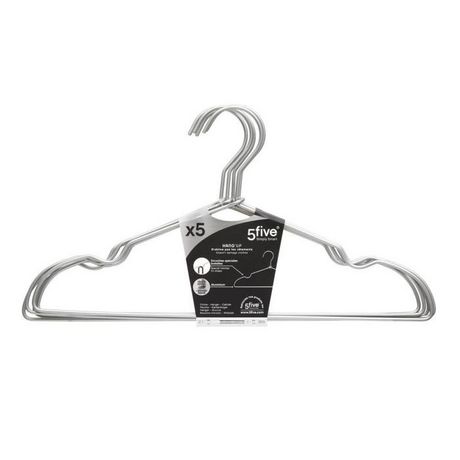Informations Techniques : Dimensions : L. 40,5 x l. 0,3 x H. 21 cm Matière : Aluminium Spécificités : Robuste & Léger Lot de 5 cintres Avec encoches spéciales bretelles N'abîme pas les vêtements Poids : 0,03 kg Couleur : Argent