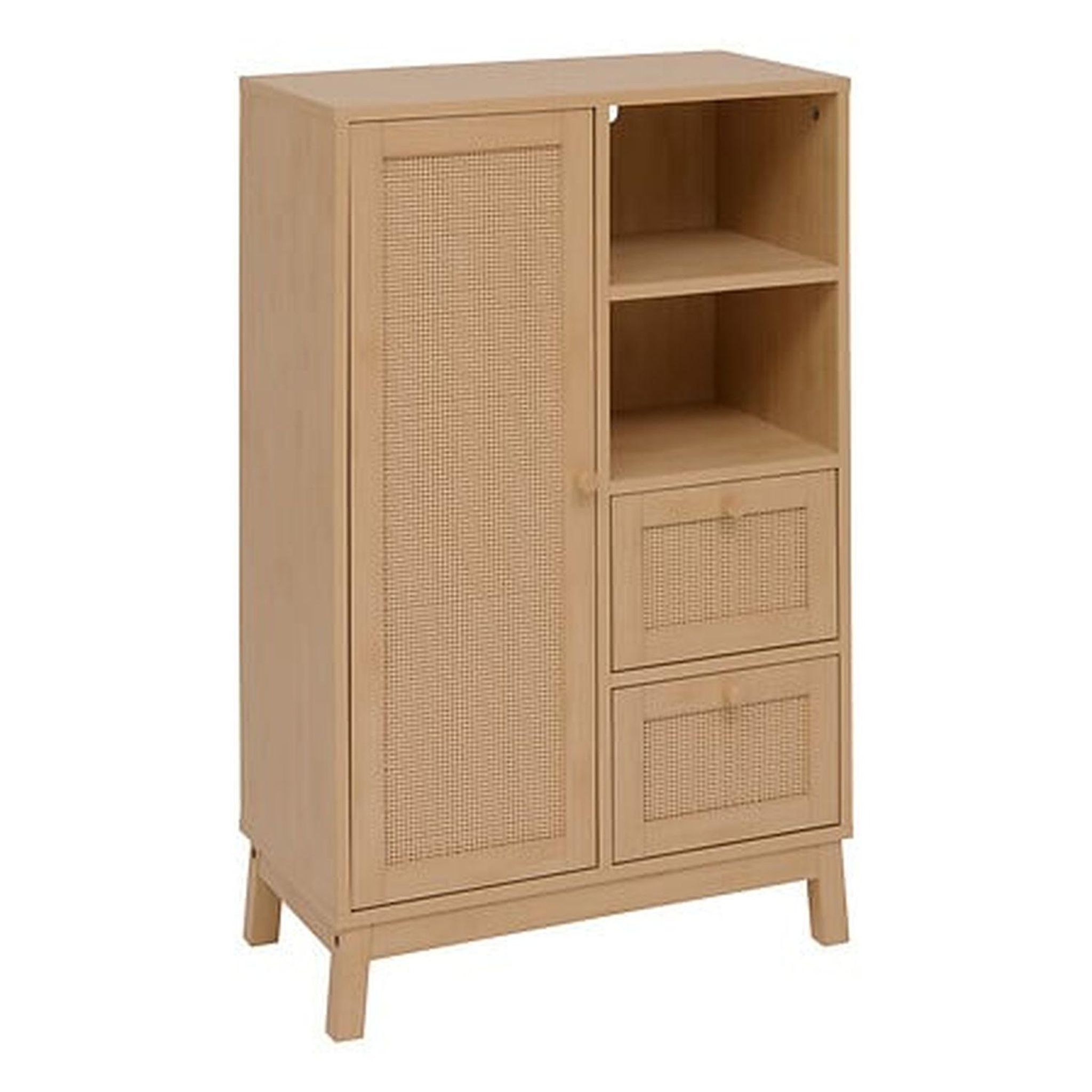 Ce meuble de rangement en MDF et rotin combine charme naturel et fonctionnalité. Grâce à ses deux tiroirs, sa porte et ses étagères intérieures, il offre une solution idéale pour organiser linge, vaisselle ou objets du quotidien. Son design chaleureux s'intègre facilement dans un salon, une chambre ou une entrée.