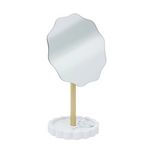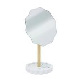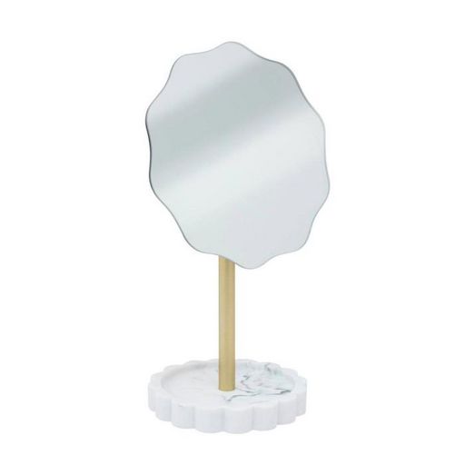 Informations Techniques : Dimensions : L. 16,4 x l. 12,2 x H. 27,2 cm Matières : Polyrésine & Verre Spécificités : Pratique & Déco Miroir à poser design Avec plateau à bijoux Socle effet marbre Miroir ondulé Poids : 0,55 kg Couleur : Blanc & Or
