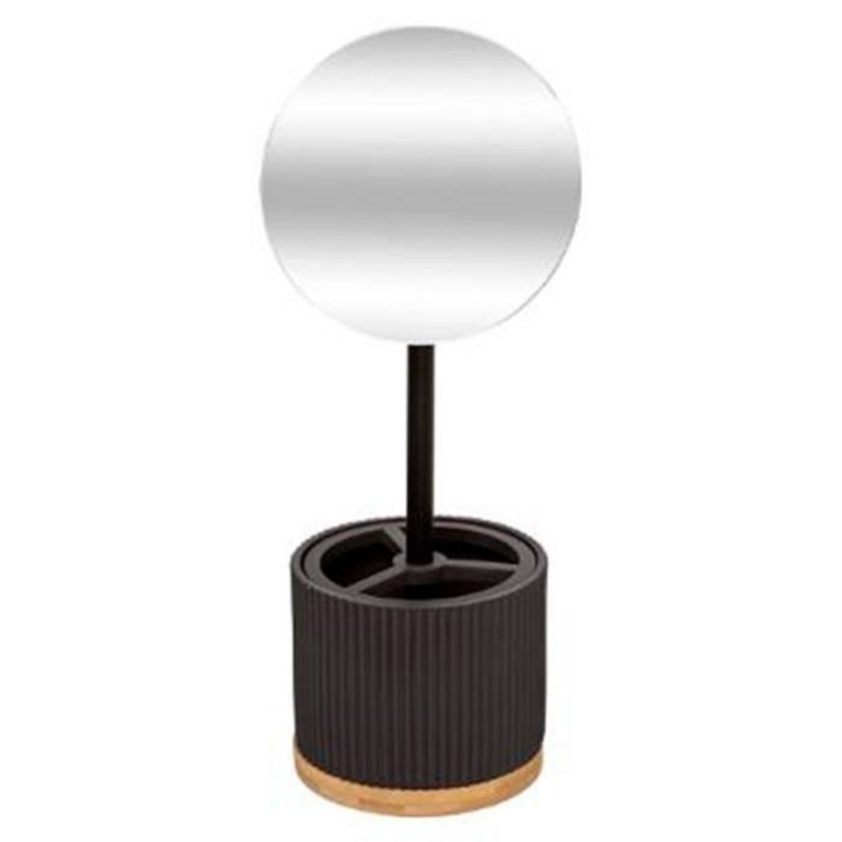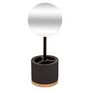 Informations Techniques : Dimensions : D. 14 x H. 35 cm Miroir : D. 14 cm Base Organiseur : D. 12 x H. 10 cm Matières : Résine & Pierre Spécificités : Pratique & Déco Miroir à Poser Zoom x3 Pot Organiseur à maquillage inclus Forme Ronde Poids : 0,912 kg Couleur : Charbon