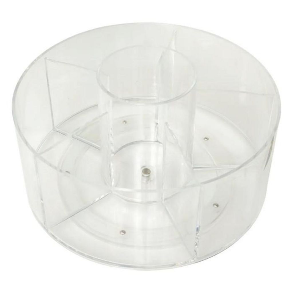 Informations Techniques : Dimensions : D. 23,1 x H. 12,8 cm Matière : Polystyrène Spécificités : Pratique & Utile Organisateur de maquillage rotatif Avec 6 compartiments Poids : 0,65 kg Couleur : Transparent