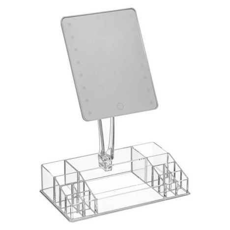 Informations Techniques : Dimensions : L. 28,2 x l. 16,4 x H. 38 cm Matière : Polystyrène Spécificités : Pratique & Utile Organiseur 13 compartiments Avec miroir tactile 16 LEDs et pivotant à 90° Piles non incluses Type de piles : 4 x LR6 - AA - 1,5V Poids : 0,89 kg Couleur : Transparent