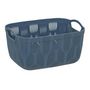 Informations Techniques : Dimensions : L. 23 x l. 16,7 x H. 12 cm Matière : Plastique Spécificités : Pratique & Design Panier de rangement design Design ajouré à motifs Avec 2 poignées Capacité : 3,2L Poids : 0,16 kg Couleur : Bleu Gris