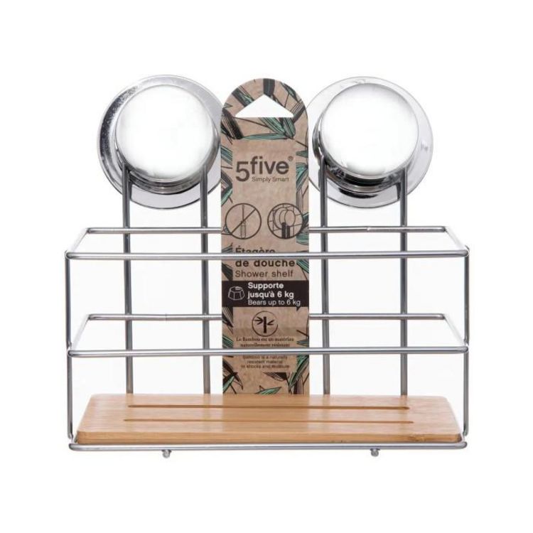 Informations Techniques : Dimensions : L. 19 x P. 12 x H. 18,5 cm Matières : Métal & Bambou Spécificités : Pratique & Déco Etagère de douche Sans perçage Avec 2 ventouses Poids max supporté : 6 kg Poids : 0,388 kg Couleur : Naturel
