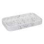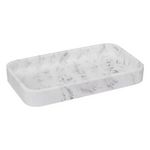 Informations Techniques : Dimensions : L. 19 x l. 11 x H. 2,5 cm Matière : Résine Spécificités : Pratique & Utile Plateau de Rangement Forme Rectangulaire Design effet Marbre Poids : 0,365 kg Couleur : Blanc