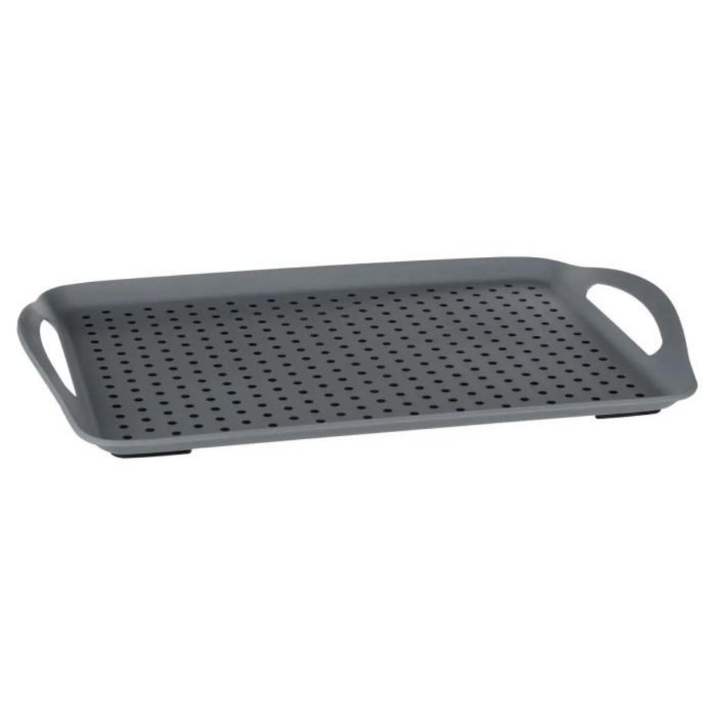 Informations Techniques : Dimensions : L. 45 x l. 32 x H. 5 cm Matières : Polypropylène & TPE Spécificités : Pratique & Stable Plateau de service rectangulaire Système antiglisse Avec picots antidérapants Poids : 0,42 kg Couleur : Gris