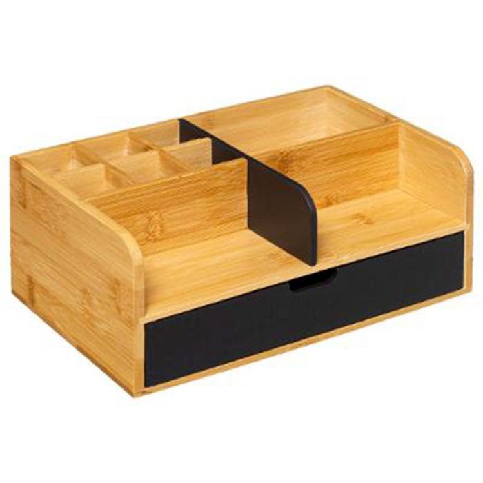 Informations Techniques : Dimensions : L. 25 x l. 10 x H. 15,5 cm Matière : Bambou Spécificités : Pratique & Utile Plateau Organiseur Compartimenté 1 Tiroir avec Séparateur Milieu Amovible Poids : 0,782 kg Couleur : Charbon