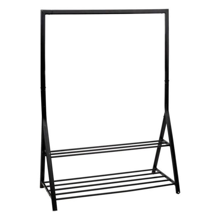 Informations Techniques : Dimensions : L. 121 x l. 56,5 x H. 167 cm Matière : Métal Spécificités : Pratique & Utile Portant à vêtements Avec 2 étages À monter soi-même Poids max supporté : Total : 90 kg Étagères : 20 kg Barre : 50 kg Poids : 6,7 kg Couleur : Noir