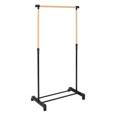 Informations Techniques : Dimensions : L. 83-122 x l. 42 x H. 95,5-166 cm Matière : Acier Spécificités : Pratique & Fonctionnel Portant à vêtements extensible Design effet bois Roues avec stopper À monter soi-même Poids max supporté : 12 kg Poids : 1,6 kg Couleur : Noir