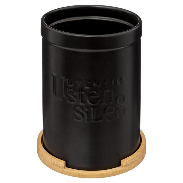 Informations Techniques : Dimensions : D. 12,8 x H. 18 cm Matières : Grès & Bambou Spécificités : Pratique & Utile Pot à ustensiles Avec socle en bambou Forme ronde Poids : 0,75 kg Couleur : Noir