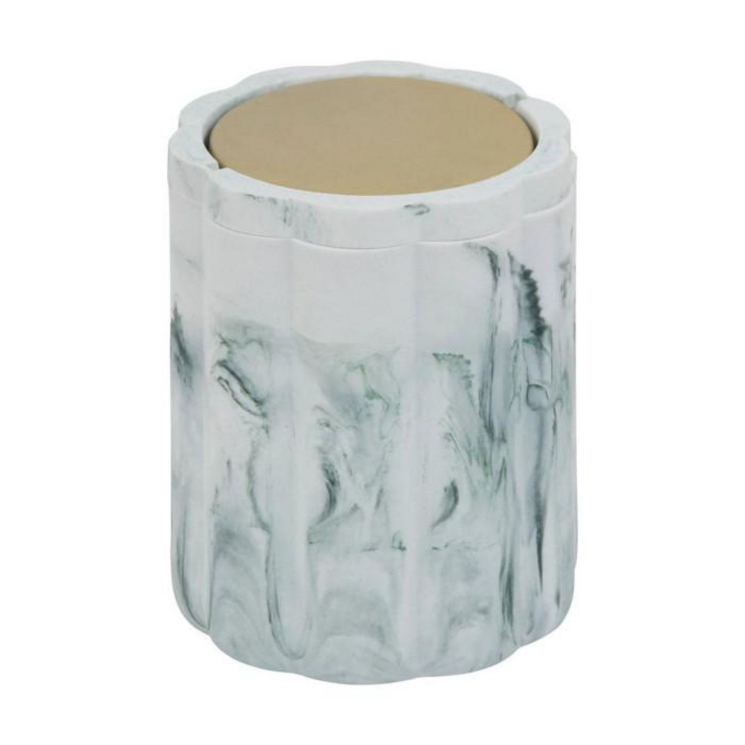 Informations Techniques : Dimensions : D. 12 x H. 15,9 cm Matière : Polyrésine Spécificités : Pratique & Déco Petite poubelle salle de bain Effet marbre Avec couvercle pivotant doré Design ondulé Poids : 0,75 kg Couleur : Blanc & Or