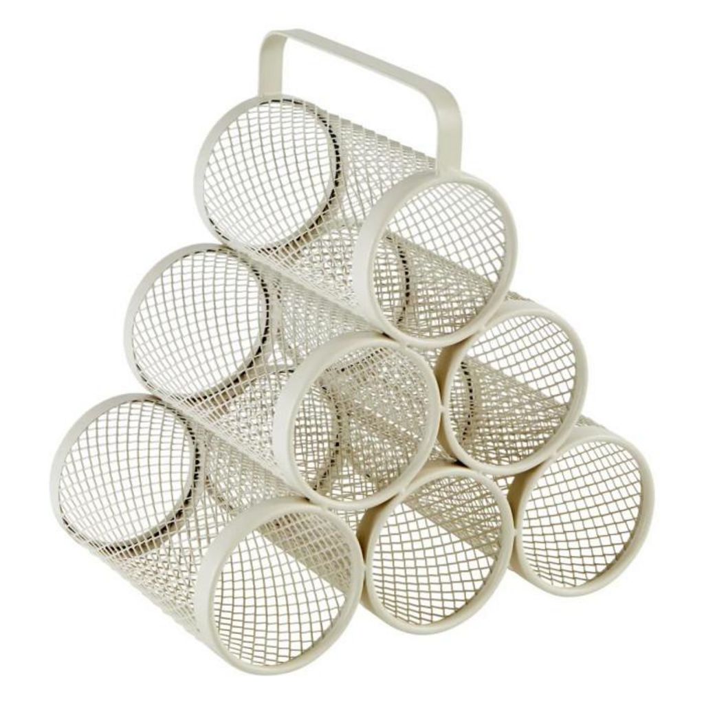 Informations Techniques : Dimensions : L. 30 x l. 18,5 x H. 28 cm Anse : L. 18,5 x H. 4 cm Matière : Acier Spécificités : Tendance & Moderne Range-bouteilles design Peut contenir 6 bouteilles Poids : 0,72 kg Couleur : Beige