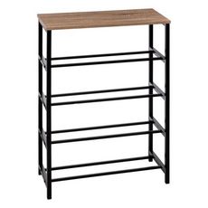 Informations Techniques : Dimensions : L. 63 x l. 30 x H. 90,5 cm Matières : Panneaux de particules & Fer Spécificités : Pratique & Fonctionnel Range-chaussures console Forme rectangulaire À monter soi-même Capacité : 12 paires Poids max supporté : Plateau : 5 kg Étagères : 5 kg Poids : 5,7 kg Coule