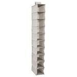 Informations Techniques : Dimensions : L. 30 x l. 15 x H. 120 cm Matières : Polyester, Polypropylène & Coton Spécificités : Pratique & Utile Rangement Chaussures 10 Cases A Suspendure Peut contenir 10 Paires de Chaussures Poids : 0,7 kg Couleur : Naturel