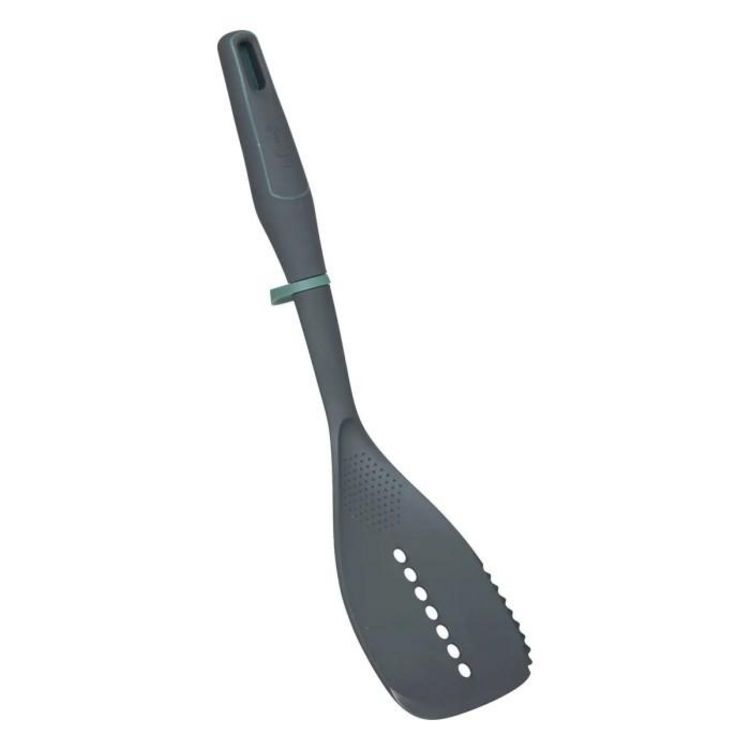 Informations Techniques : Dimensions : L. 8,9 x l. 4,5 x H. 35 cm Matières : PBT & Polypropylène Spécificités : Ergonomique & Utile Spatule de cuisine Avec anneau de maintien Manche revêtement doux Poids : 0,1 kg Couleur : Gris