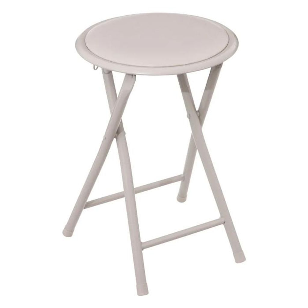 Informations Techniques : Dimensions : D. 30 x H. 45 cm Matières : Acier, Panneaux de particules & PVC Spécificités : Pratique & Astucieux Tabouret pliant rond Facile à ranger Poids : 1,55 kg Couleur : Taupe