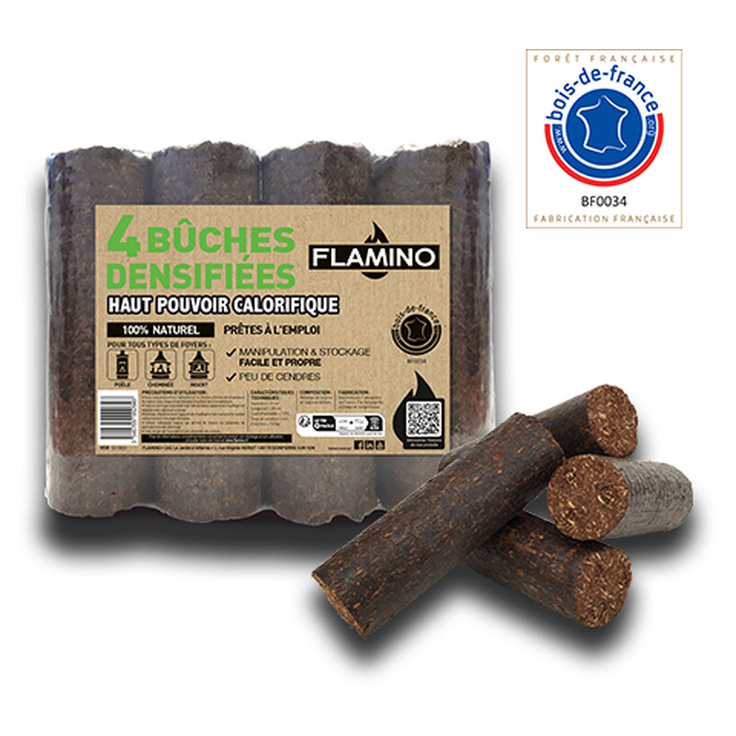 Les bûches densifiées Flamino sont la solution idéale pour chauffer efficacement votre intérieur tout en respectant l'environnement. Conçues à partir de sciure et de copeaux de bois recyclés, ces bûches compressées ne contiennent ni colle, ni liants chimiques. Elles sont 100% naturelles et prêtes à l'emploi.