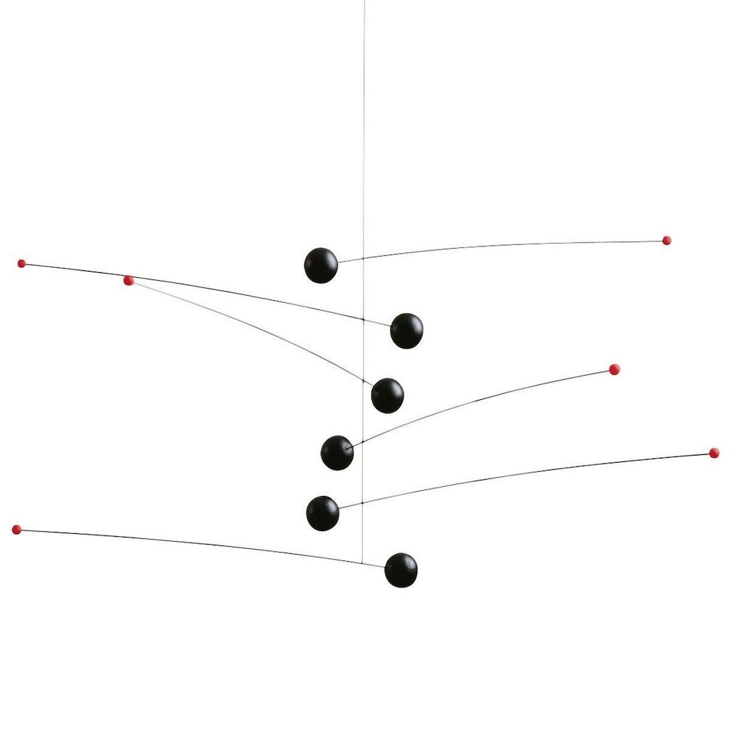 Le grand mobile Futura est idéal pour une grande salle , qui avec son beau design peut ajouter du mouvement à la salle . Le mobile est le premier mobile de Ole Flensted , fait en 1970 . Bars de la lumière et des éléments lourds dans une tension dynamique suggère six planètes avec leurs satellites -