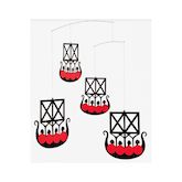Les 4 Vikingships (les 4 bateaux vikings). Conçu par Lizzie Thyssen, design de 1980. Une version stylisée d'une flotte de vikings inspirée par les illustrations gravées dans un rocher de l'île suédoise de Gotland. Les mobiles Flensted symbolisent les multiples facettes de la vie, la seule constante
