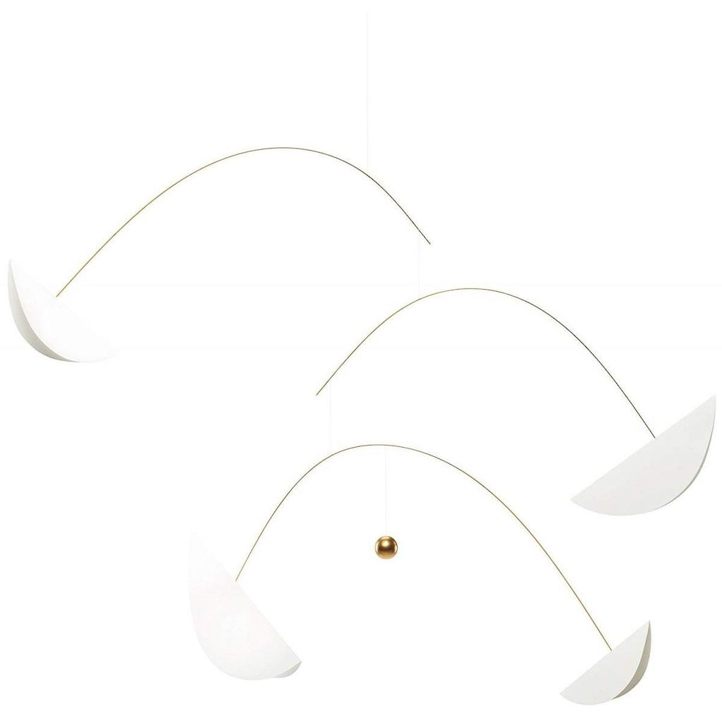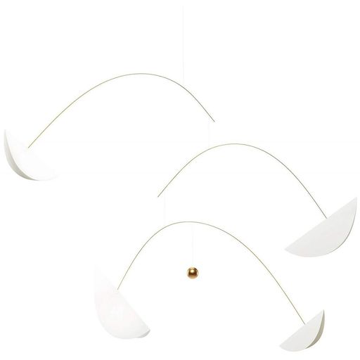 Un globe entre la nuit et le jour, entre le ciel et la terre. Ce mobile est maintenant conçu avec des feuilles blanches et une balle d'or. Conception: Ole Flensted. Taille: 70 x 125 cm. Matériel: Feuille sérigraphique, bois, bois doré inox