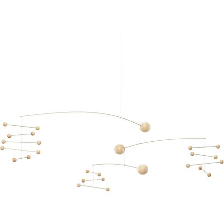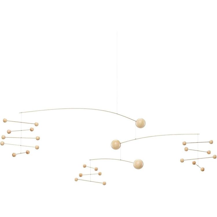Symphonie, nature - grande échelle. Conçu par Ole Flensted. Les couleurs de la nature en boules de bois et en barres dorées sont l'expression de cet immense mobile de plus de 2 mètres d'envergure. Si vous avez une grande pièce avec au moins 4 mètres de hauteur sous plafond, c'est peut-être un bon ch