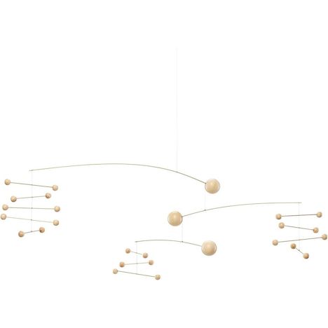 Symphonie, nature - grande échelle. Conçu par Ole Flensted. Les couleurs de la nature en boules de bois et en barres dorées sont l'expression de cet immense mobile de plus de 2 mètres d'envergure. Si vous avez une grande pièce avec au moins 4 mètres de hauteur sous plafond, c'est peut-être un bon choix. Les mobiles Flensted symbolisent les multiples facettes de la vie, la seule constante étant le mouvement . Même dans les pièces les mieux fermées et visiblement les plus calmes, les mobiles Flensted frémissent au moindre mouvement d'air ou suivent en quelque sorte leur propre inspiration.