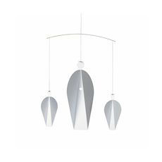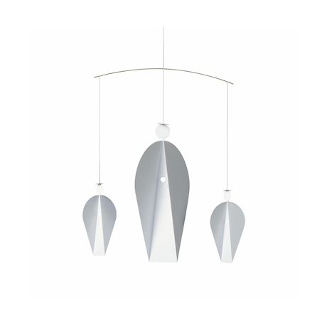 Turning Angels - Un mobile: une décoration, souvent une conception humoristique de l'imagination artistique. Suspendu à par un unique fil ou câble, le mobile est constitué de plusieurs formes et matériaux différents, dont chacun réagit, de façon interdépendante, au moindre courant d'air d'un intérieur. L'équilibre en est le facteur essentiel, aussi bien pour le mouvement que pour l'effet visuel, permettant à chaque forme de devenir une entité tri-dimensionnelle aux variations infinies de mouvements, à travers la lumière et l'espace. Design: Ole Flensted. Dimensions: 40x35cm