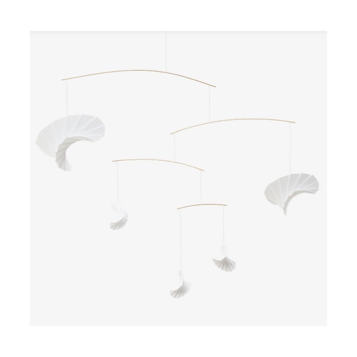 Conçu par Carina Caia Les Wave Mobile sont pliées à la main dans une feuille de plastique blanche suspendue dans des barres en acier inoxydable plaqué or. Couleurs: blanc Matériaux: Feuille sérigraphique, acier inoxydable Tailles: 90 x 80 cm