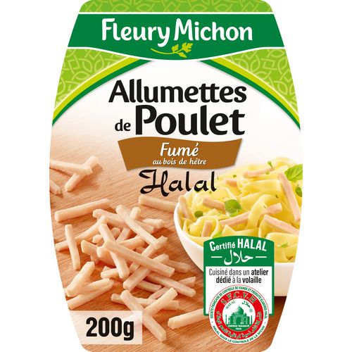 Fleury Michon propose une délicieuse recette Halal d'allumettes de poulet, fumées au bois de hêtre. Produit élaboré sous le contrôle de la SFCVH.