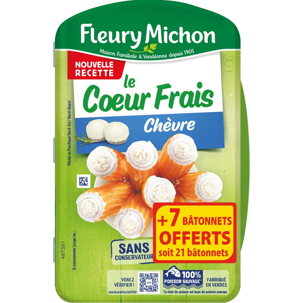 Découvrez le Coeur Frais chèvre de Fleury Michon. De délicieux bâtonnets de surimi au coeur de fromage pour conjuguer plaisir et équilibre. Ils peuvent se déguster au gré de vos envies : en salade, à l'apéritif, en encas... En toutes circonstances laissez vous séduire par ce mariage inédit de saveurs