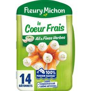 Découvrez le Coeur Frais Fromage Ail et Fines Herbes de Fleury Michon. De délicieux bâtonnets élaborés à partir de chair de poisson sauvage au coeur de fromage frais à déguster en salade, à l'apéritif ou en encas, avec la juste dose à chaque bouchée.