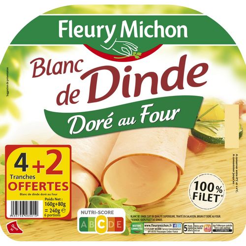 Blanc de dinde cuit de qualité supérieure, traité en salaison, bruni et doré au four.