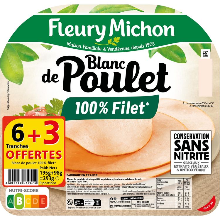 Le blanc de poulet de qualité Fleury Michon garanti Conservation Sans Nitrite* *grâce aux extraits végétaux et antioxydant