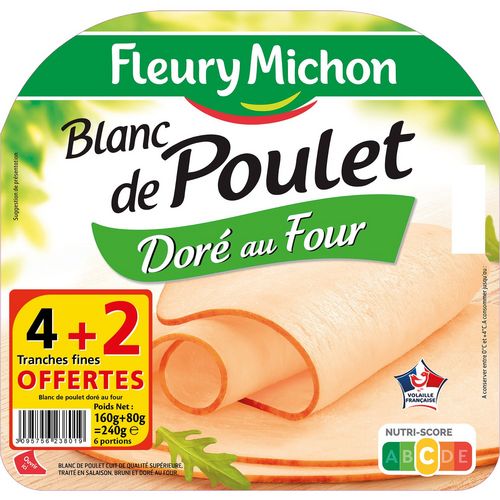 Blanc de poulet cuit de qualité supérieure, traité en salaison, bruni et doré au four.