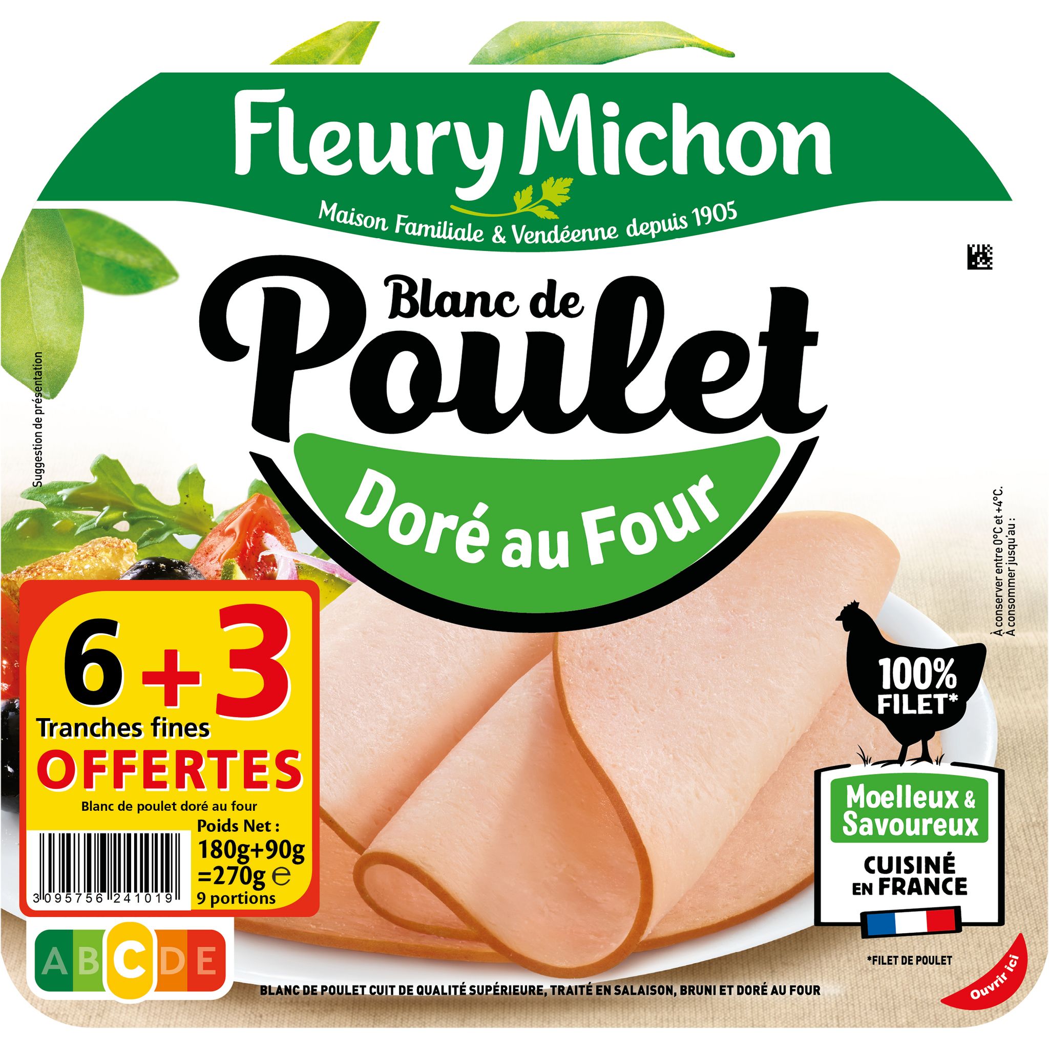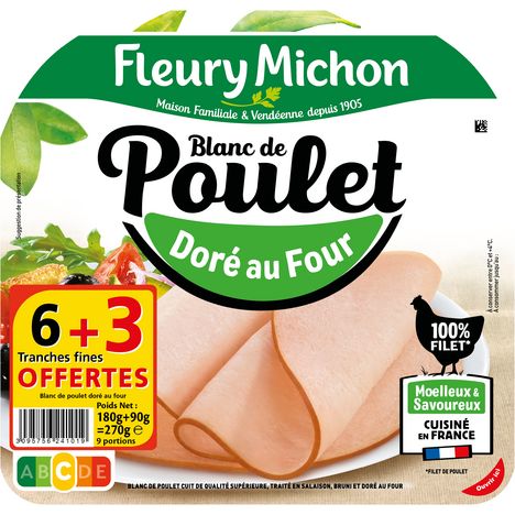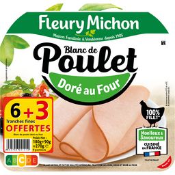 Blanc de poulet cuit de qualité supérieure, traité en salaison, bruni et doré au four Un délicieux blanc de poulet 100% filets et sans sel nitrité Comme dans les yaourts, nos cuisiniers charcutier mettent des ferments, qui, associés à nos jus de légumes, permettent d'assurer une bonne conservation du blanc de poulet. C'est pourquoi il est si bon !