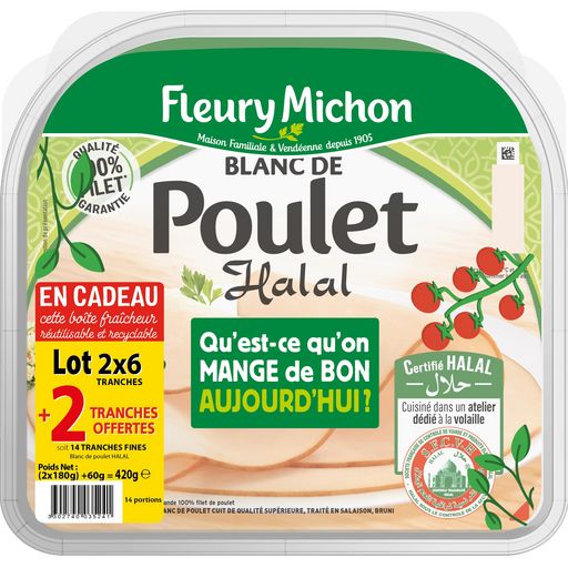 Découvrez la délicieuse recette de Blanc de Poulet Halal Fleury Michon ! Élaborée à partir de viande 100% filet et cuisinée dans le respect du rite musulman, vous allez pouvoir accompagner toutes vos envies.