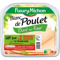 Blanc de poulet cuit de qualité supérieure, traité en salaison, bruni et doré au four.