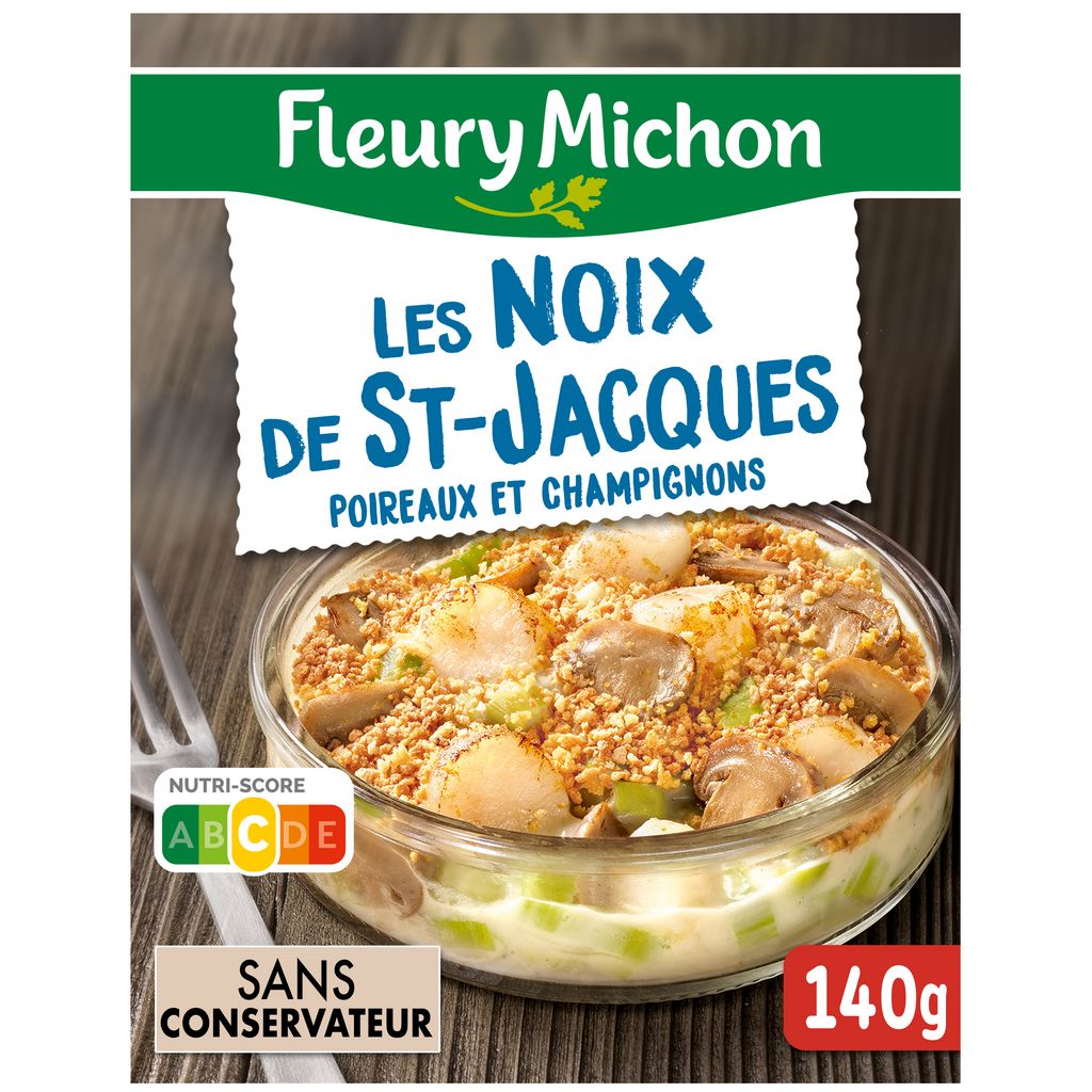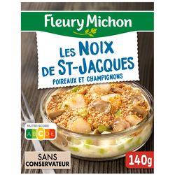 Ingrédients : Ingrédients: Noix de SAINT-JACQUES* 20% (Zygochlamys Patagonica Argentine ou Chlamys Opercularis Islande / Iles Féroé ou Argopecten Purpuratus Pérou), poireaux 18%, eau, CREME fraîche 9,1%, jus de cuisson des noix de SAINT-JACQUES*, champignons de Paris 9%, EMMENTAL 5,3%, échalotes 4.7%, BEURRE, vermouth Noilly Prat® 1.9% (contient LAIT), amidon de riz, chapelure 1,7% (contient BLE), poudre de jaune d'OEUFS, huile d'olive vierge, sel, jus concentré de champignons, poivre. * voir à l'emplacement de la date limite de consommation._Traces éventuelles de poissons, crustacés, soja