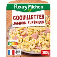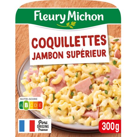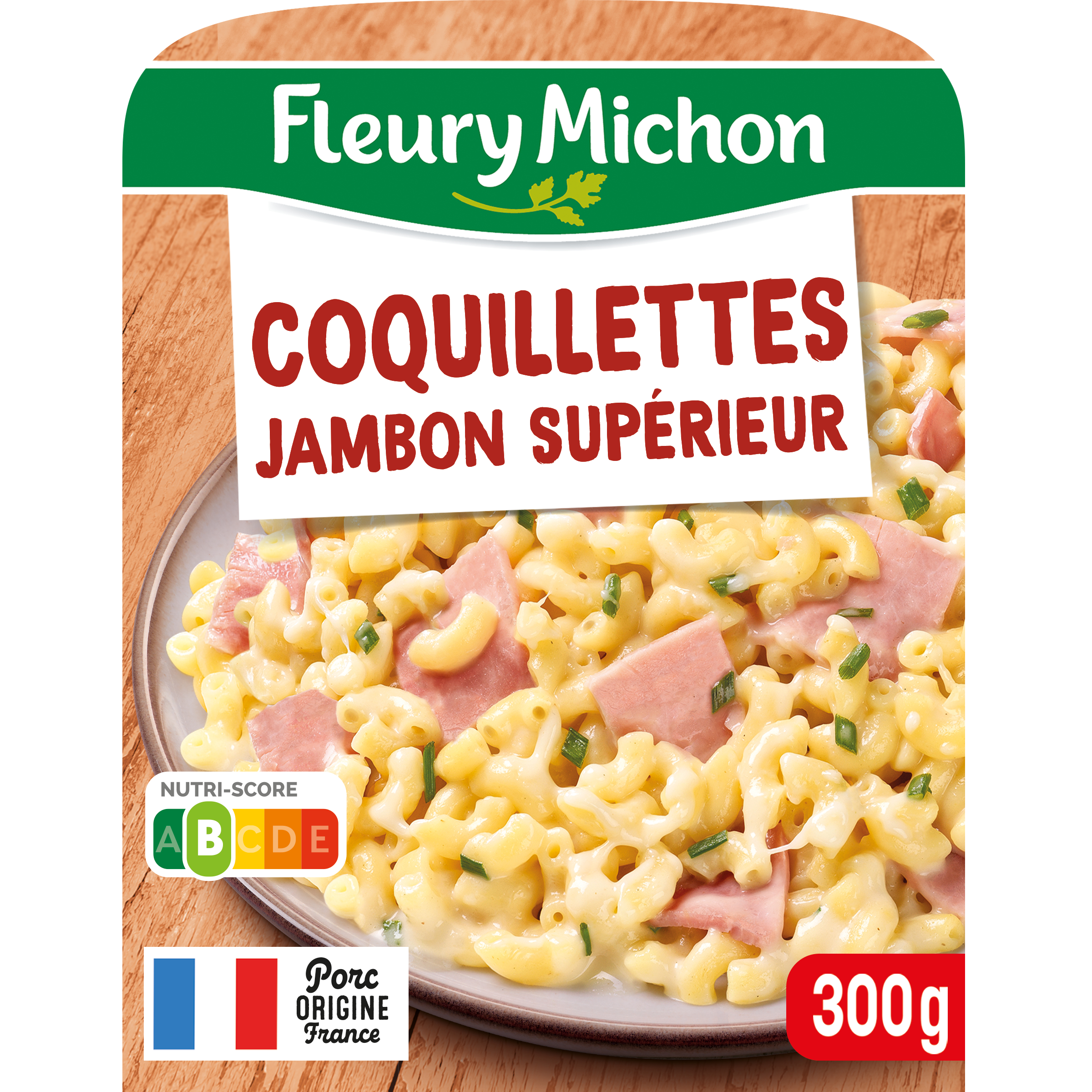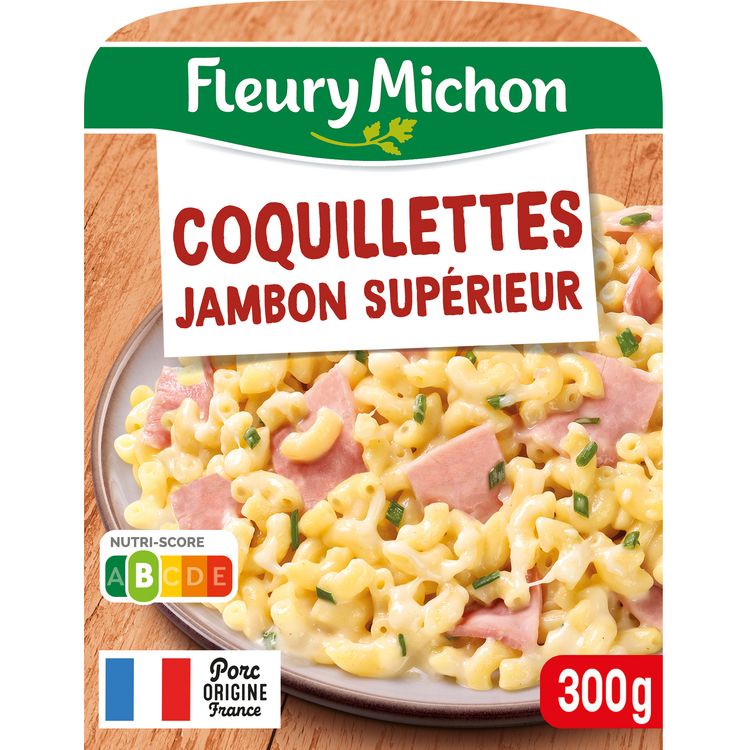 Ingrédients : Ingrédients: Pâtes coquillettes 31% (eau, semoule de BLE dur, poudre de blanc d'OEUFS), eau, fond de volaille (eau, os de poulet, sel), jambon cuit de qualité supérieure 10% [jambon de porc, eau, bouillon (eau, os et viande de porc, plantes aromatiques, ail, épices, jus concentrés de carottes et de tomates, vin blanc, oignons, poireaux, CELERI, carottes, sucre), sel, arômes naturels (présence naturelle de polyphénols), chlorure de potassium, conservateur : vinaigre tamponné, dextrose, antioxydant : acide ascorbique, poivre], CREME fraîche 8,9%, EMMENTAL 4%, oignons, farine de BLE, huile de colza, ciboulette, ail, sel, poivre._Traces éventuelles de moutarde, soja