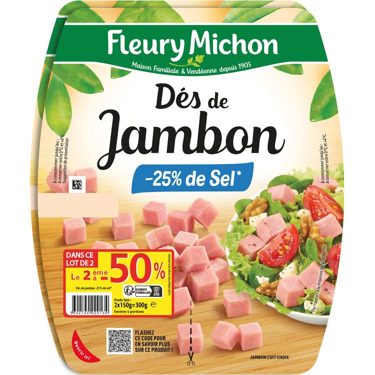 De délicieux dés de jambon pour agrémenter vos plats avec 25% de sel en moins*. Notre secret ? Nos cuisiniers charcutiers diminuent le sel et cuisinent des bouillons pour que ce soit toujours aussi bon ! *Par rapport à la moyenne de la catégorie.