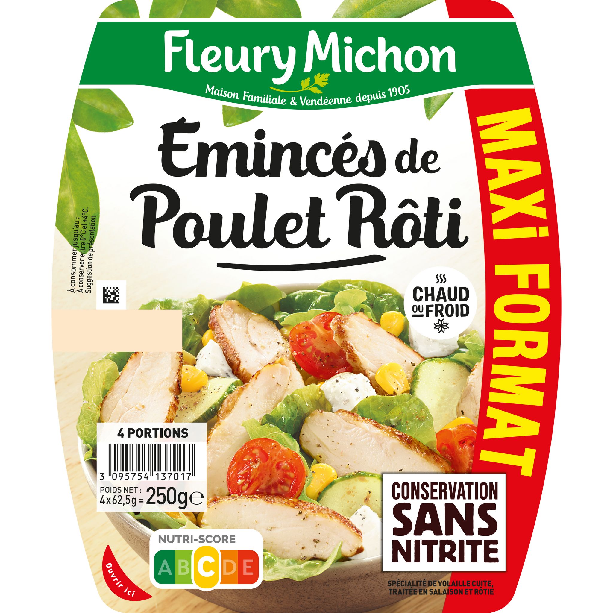 De délicieux hauts de cuisse de poulet délicatement cuisinés puis rôtis au four. Déjà tranchés, les émincés de poulet accompagneront à merveille vos salades, sandwichs et plats chauds. Un format adapté aux familles ou aux gourmands Spécialité de volaille cuite, traitée en salaison et rôtie.