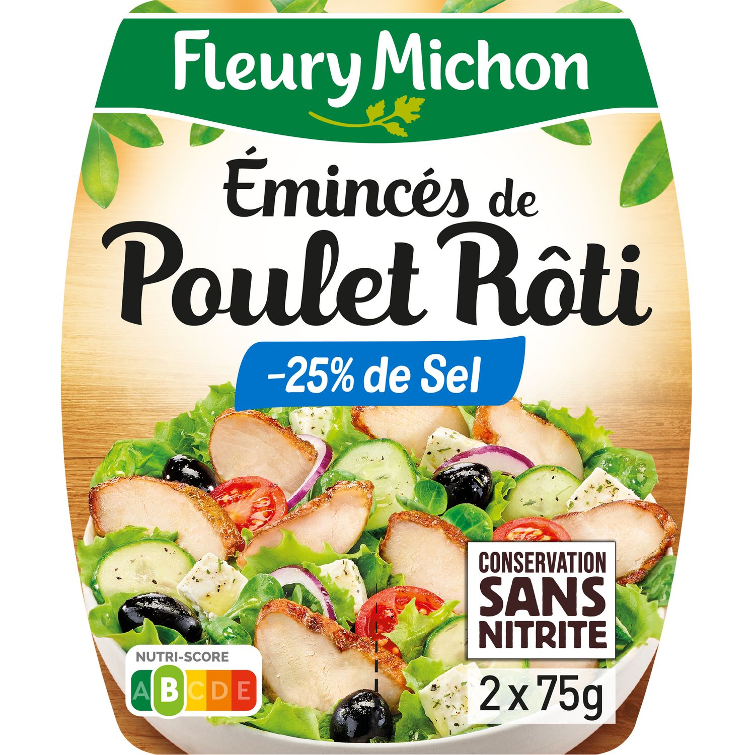 Sans nitrite et moins de sel que demander de plus. Les morceaux sont suffisamment gros pour ne pas se perdre dans la salade et on peut profiter du goût. En deux barquettes le format est très pratique . J'aurais préféré poulet français car l'UE est vaste mais élaboré en France.