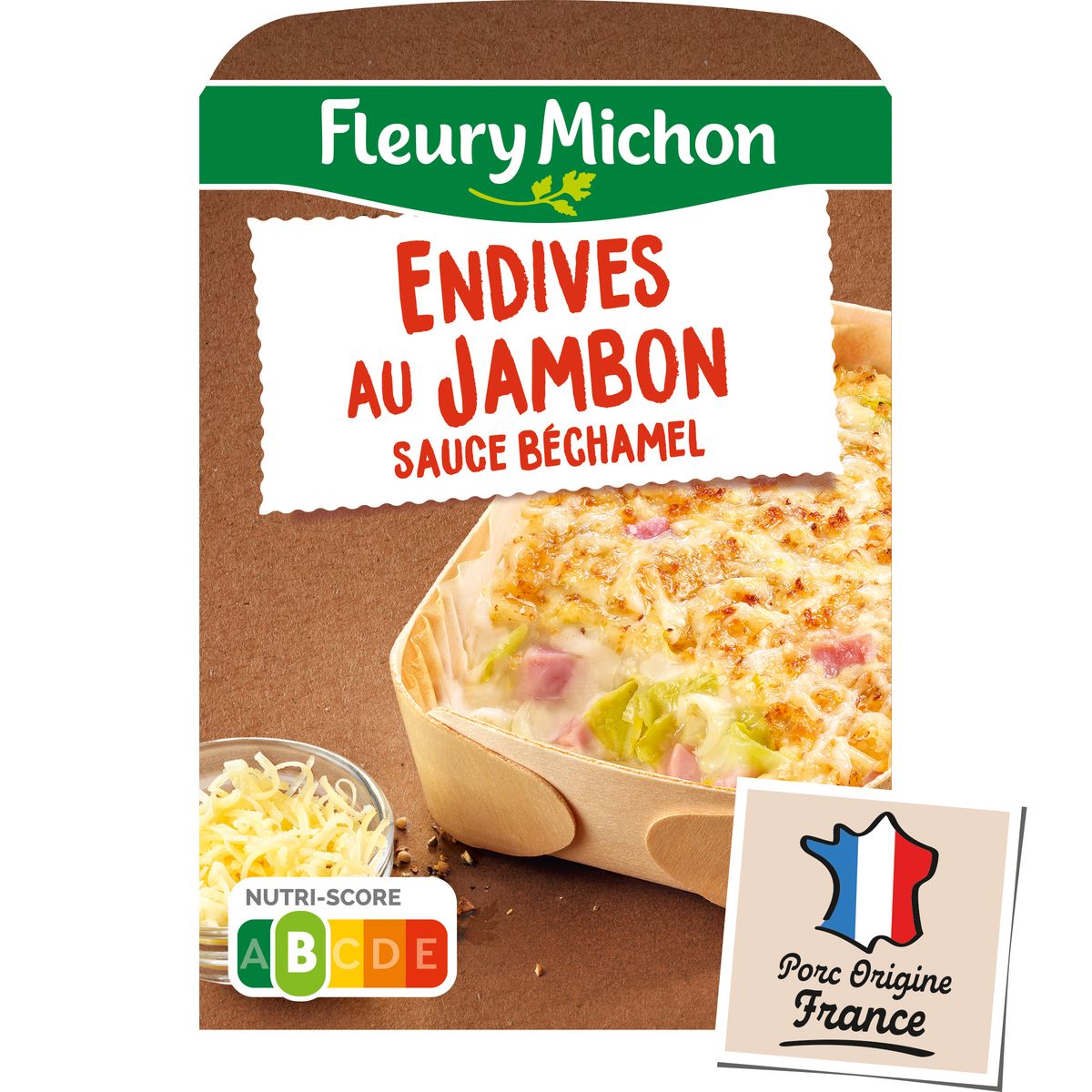 Des endives émincées recouvertes d'une onctueuse sauce béchamel et accompagnées de jambon de porc origine France. Une recette gratinée au four et présentée dans une jolie barquette en bois 100% origine France !