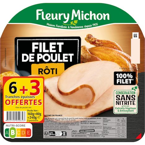 Avec de généreuses tranches épaisses, ce gourmand blanc de poulet 100% filets est issu d'une cuisson douce qui lui apporte un moelleux incomparable. Il est ensuite lentement rôti pour un goût unique de Poulet du Dimanche. En plus, il est garanti Conservation Sans Nitrite* *grâce aux extraits végétaux et antioxydant