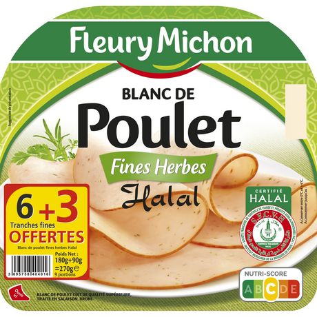 Ingrédients: Filet de poulet 93%, sel, fines herbes 0.5% (herbes de Provence (basilic, origan, romarin, thym), cerfeuil, estragon, sarriette), concentrés (betterave, blette, carotte, CELERI), dextrose de maïs, ferments, antioxydant : ascorbate de sodium, colorant : caramel ordinaire._Traces éventuelles d'oeufs