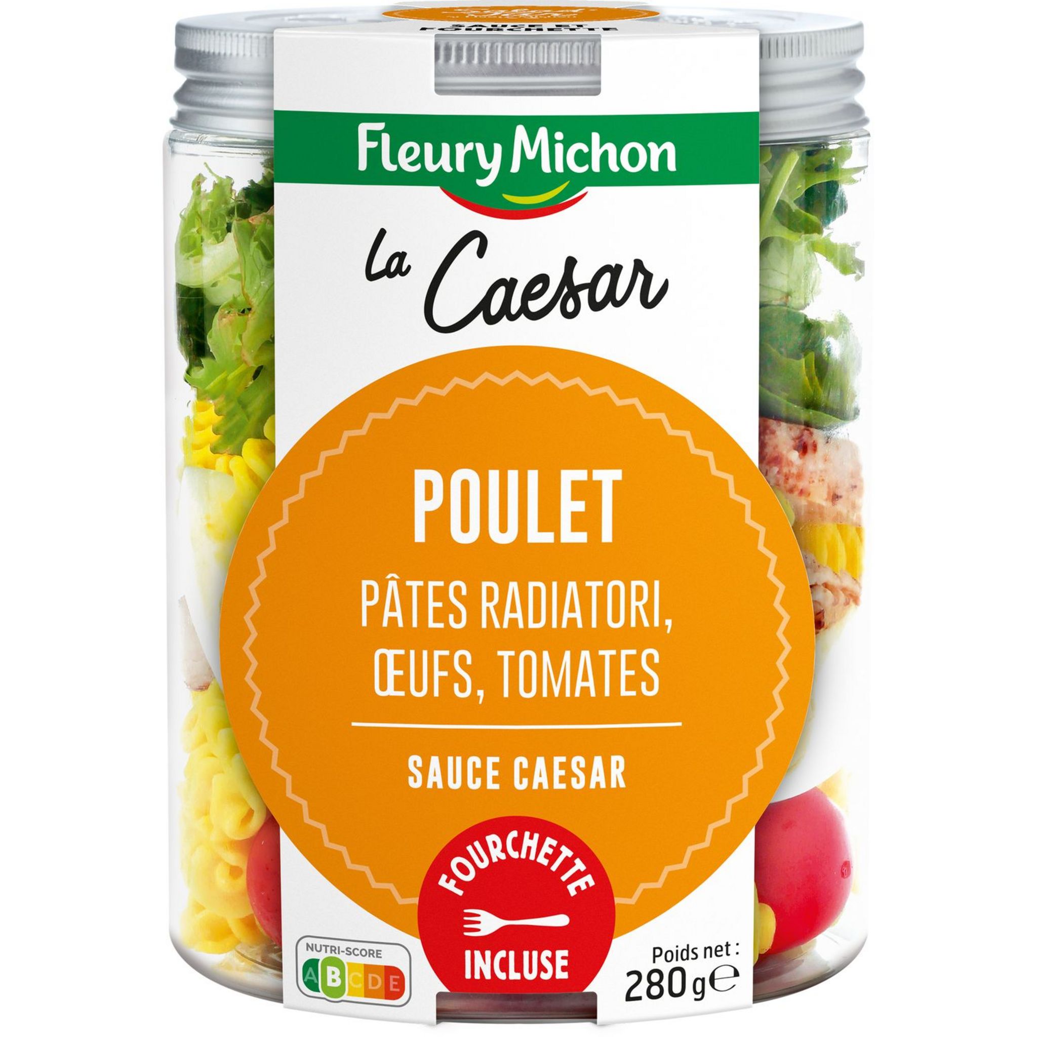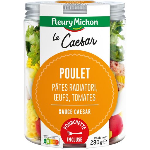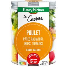 Changez de point de vue sur la Salade snacking avec les salad'jar Fleury Michon : des ingrédients frais et gourmands, présentés en couche dans un emballage transparent. Ultra pratique, la salade se mange directement dans le pot avec la fourchette fournie. Réutilisable, le pot est idéal pour laisser libre cours à votre créativité : pot à crayon, pot à perles... Caesar: Salade accompagnée de pâtes radiatoris, d'oeufs, de poulets, de tomates avec une sauce caesar.