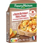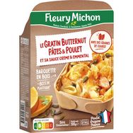 Ingrédients: Pâtes conchiglie 35% (eau, semoule de BLE dur), butternut 26%, émincés de viande de cuisse de poulet traité en salaison rôti 11% (viande de cuisse de poulet 10%, eau, fécule de manioc, dextrose, sel), eau, EMMENTAL 4.2%, CREME fraîche 3.8%, crème de riz, oignons, graines de courges 1.3%, huile de colza, sel, FROMAGE à pâte dure, amidon de riz, échalotes, persil 0.2%, sucre, BEURRE, ail, épices._Traces éventuelles d'oeufs