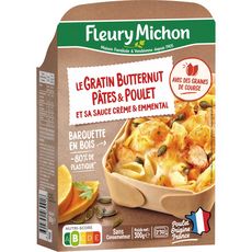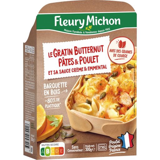 Pâtes, butternut, émincés de viande de cuisse de poulet traité en salaison rôti et emmental Un délicieux gratin avec la douceur du butternut, des conchiglie et des émincés du poulet. La recette est parsemée de graines de courges, accompagnée d'une sauce crémeuse à l'emmental et présentée dans une jolie barquette en bois !